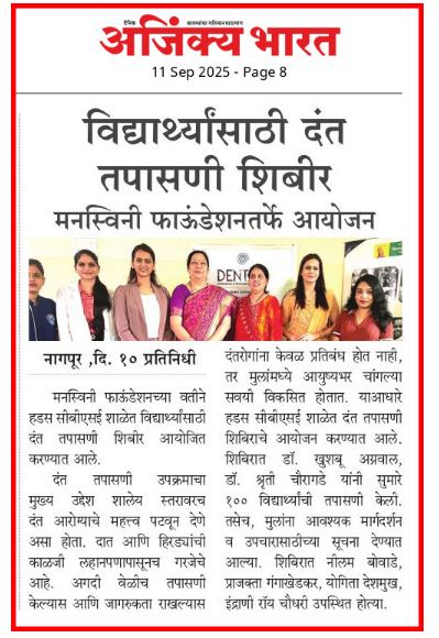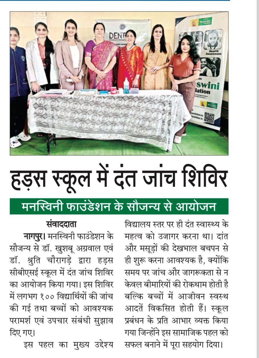 Manaswini Foundation in association with Dr. Khushbu Agrawal and Dr. Shruti Chouragade successfully organized a Dental Check-up Camp at Hadas CBSE School. Around 100 students were examined during the camp, where the doctors provided necessary guidance and prescriptions for maintaining good oral hygiene.